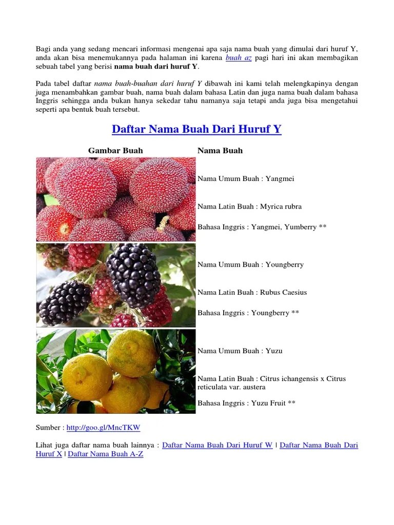 Dari a sampai z, ada beberapa jenis buah yang berawalan dari huruf z. Nama buah dari huruf y. Berikut ini adalah daftar nama buah buahan dari a sampai z dan gambarnya yang juga dilengkapi dengan nama latin buah. Buah dalam bahasa inggris, artinya (buah dalam bahasa indonesia). Dimulai dengan y dan z.